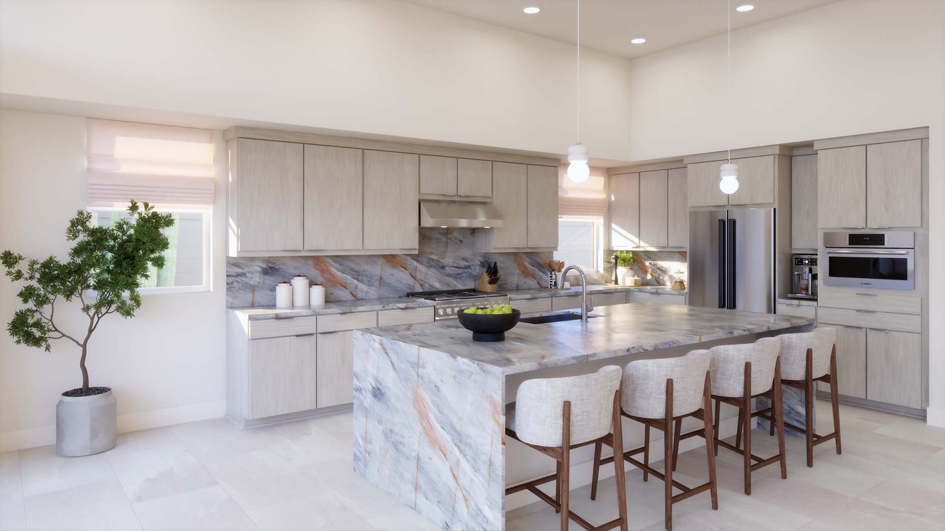 The kitchen delights with easy-care Quartz countertops adorned with a 6-inch backsplash, combining both style and functionality.