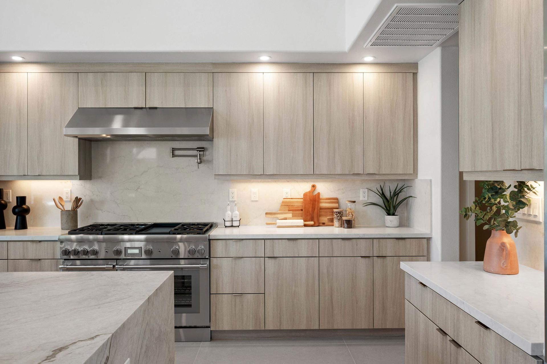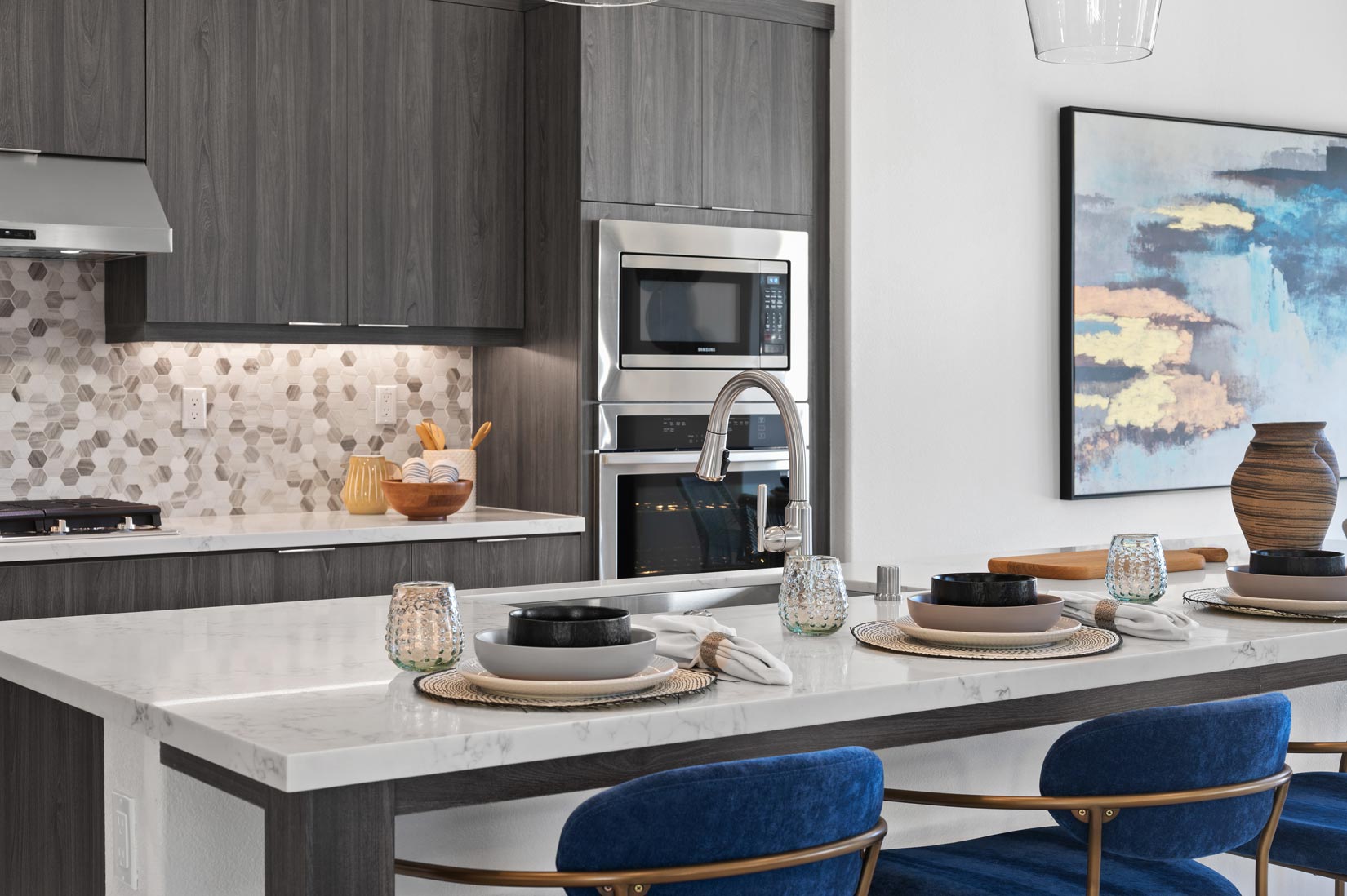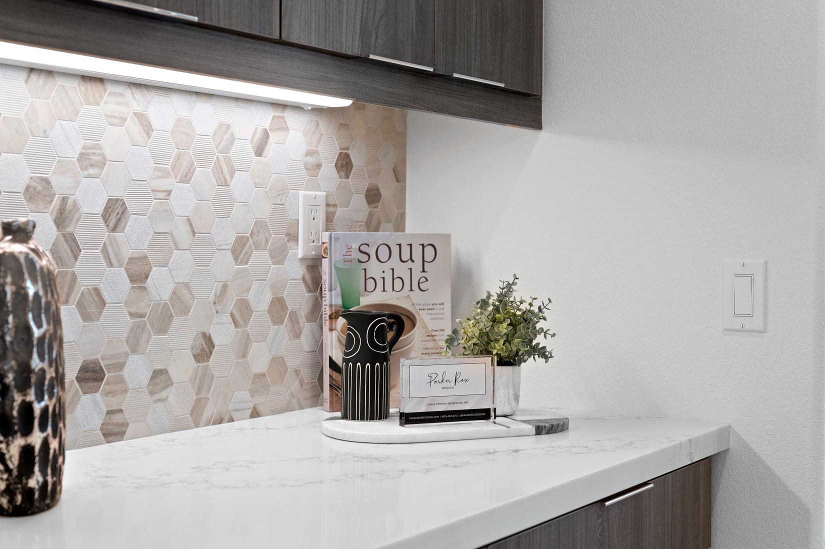 The kitchen delights with easy-care Quartz countertops adorned with a 6-inch backsplash, combining both style and functionality.